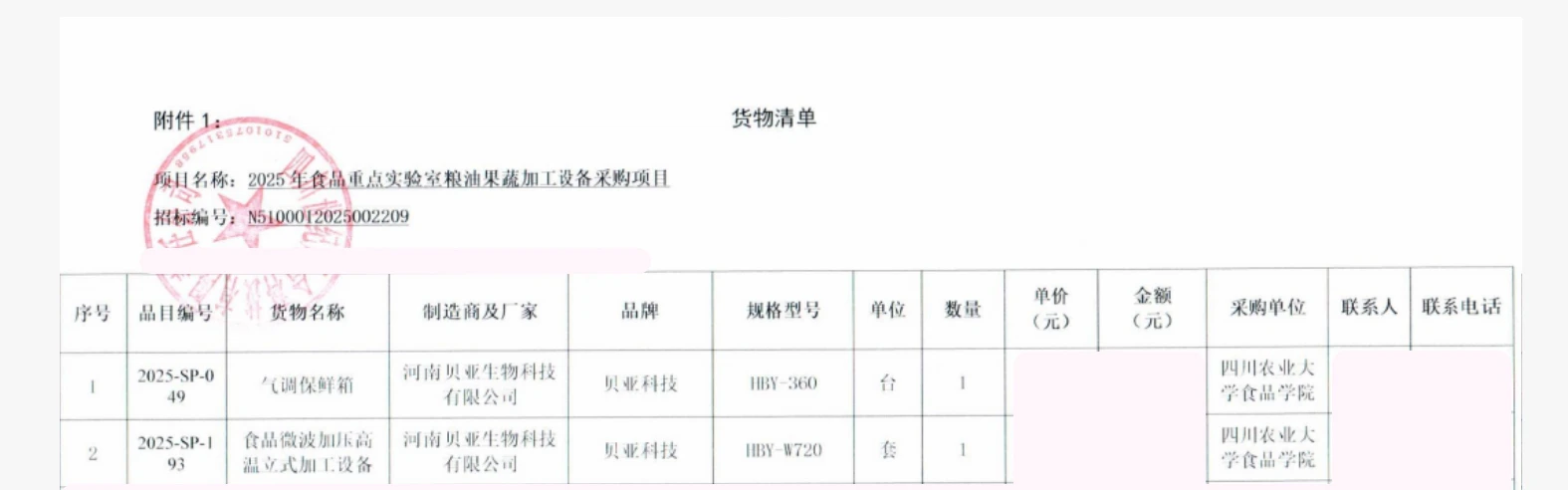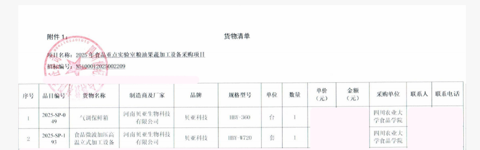 近日,河南贝亚生物科技有限公司在四川农业大学 2025 年食品重点实验室粮油果加工设备采购项目招标中,凭借雄厚的技术实力、完善的服务体系及高性价比解决方案,成功中标气调保鲜箱与食品微波加压高温立式加工设备,中标总金额 768,000 元